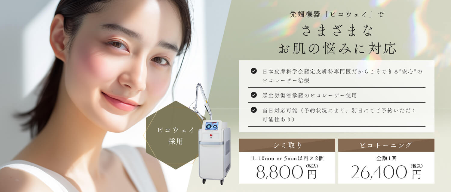 当院はピコレーザーの一種であるピコウェイを導入しています。3種類の照射モードを搭載するピコウェイは、スポット照射、トーニング、フラクショナルを活用して幅広い肌のお悩みに対応します。シミやそばかす、ニキビ跡、毛穴の開き、肝斑、くすみなどでお悩みのかたは、ぜひ一度当院までご相談ください。