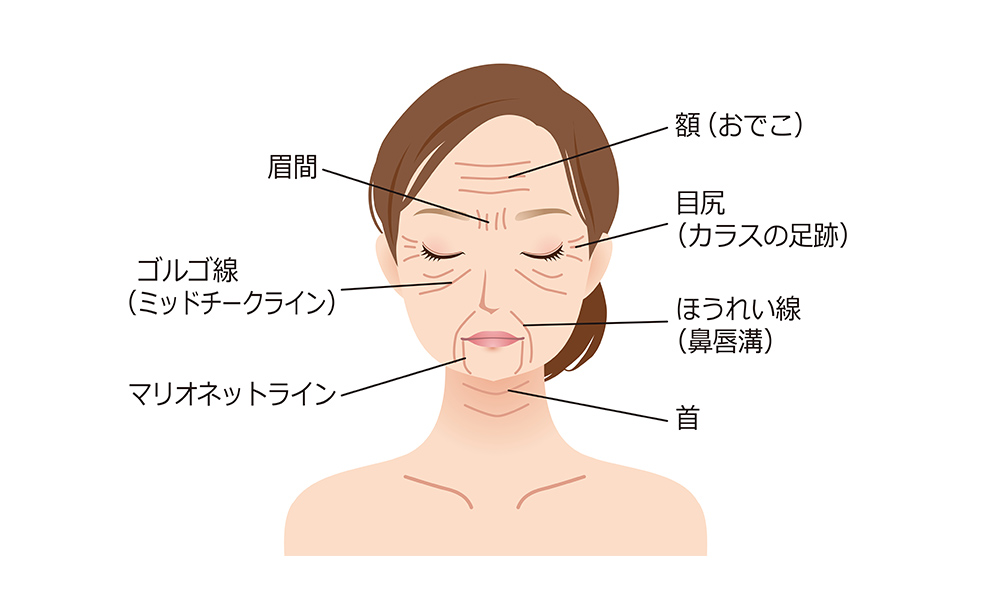 目元、口元、額、眉間などに見られるしわであり、怒ったり笑ったりした際に生じます。紫外線や加齢によるコラーゲン減少が主な原因とされています。